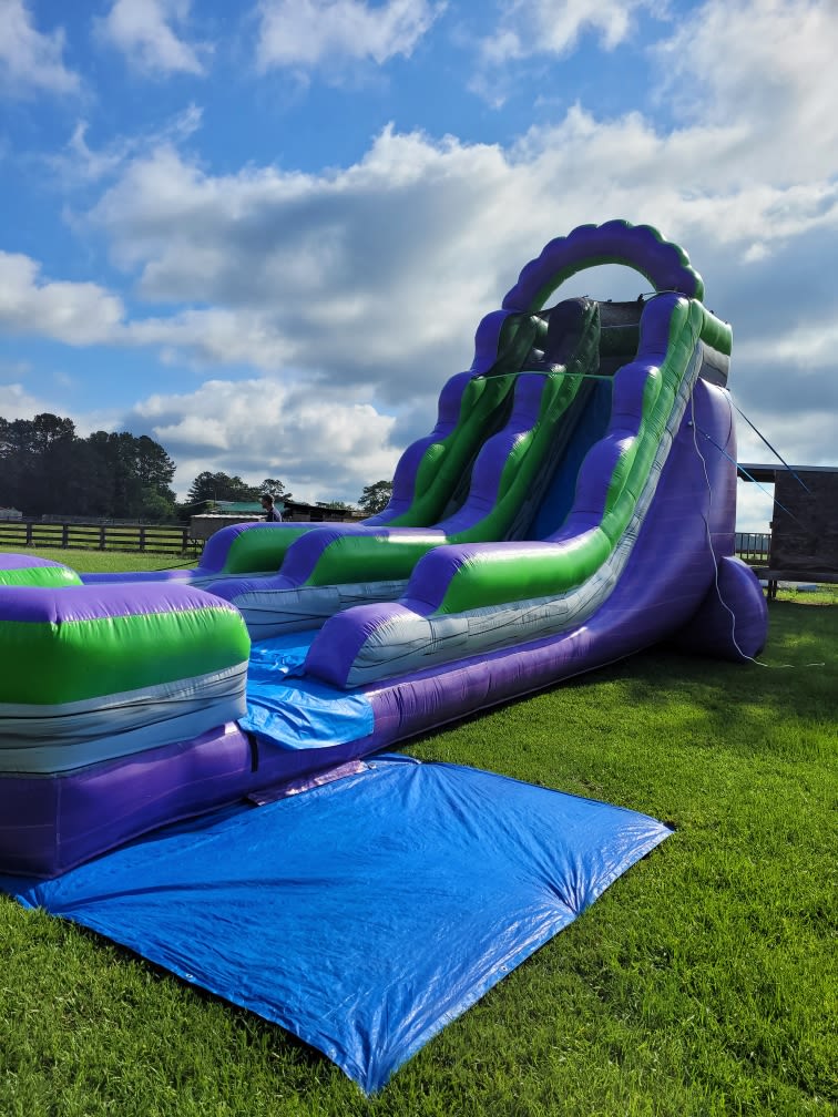 The 18 feet purple splash is perfect for any party. SWISH, SLIDE, AND SPLASH into a pool of fun! Recommended for ages 5-adult size.